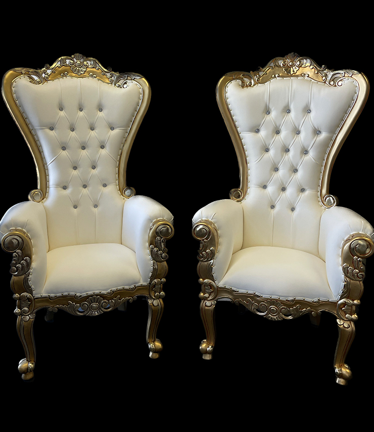 Perfect for a variety of events! From bridal showers, engagement celebrations, sweet 16, quinceañera or Rent the pair as sweetheart chairs for your wedding! Our Gold and White throne chairs stand 5.8ft tall by 3 ft wide. Rent one for $180 or Make it a pair and rent two of our throne chairs at a discounted rate $300